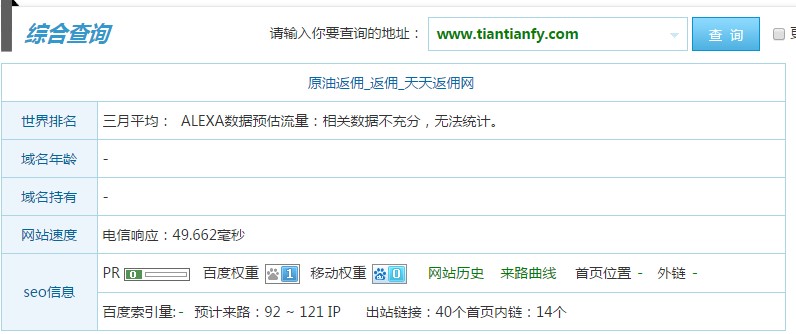 1, TDK调整。网站刚接到手的时候,标题关键词描述都是“天天返佣网”。